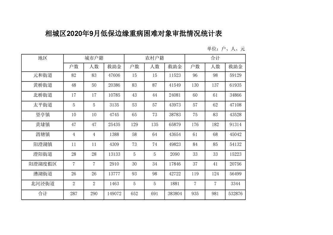 相城區(qū)2020年9月低保邊緣重病困難對(duì)象審批情況統(tǒng)計(jì)表