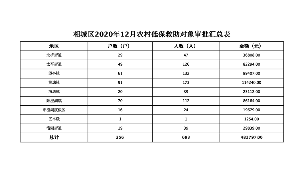 相城區(qū)2020年12月農(nóng)村低保救助對(duì)象審批匯總表