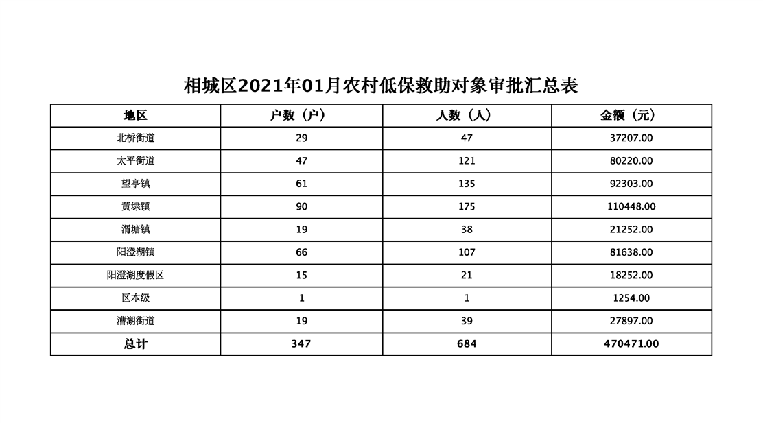 相城區(qū)2021年01月農(nóng)村低保救助對(duì)象審批匯總表