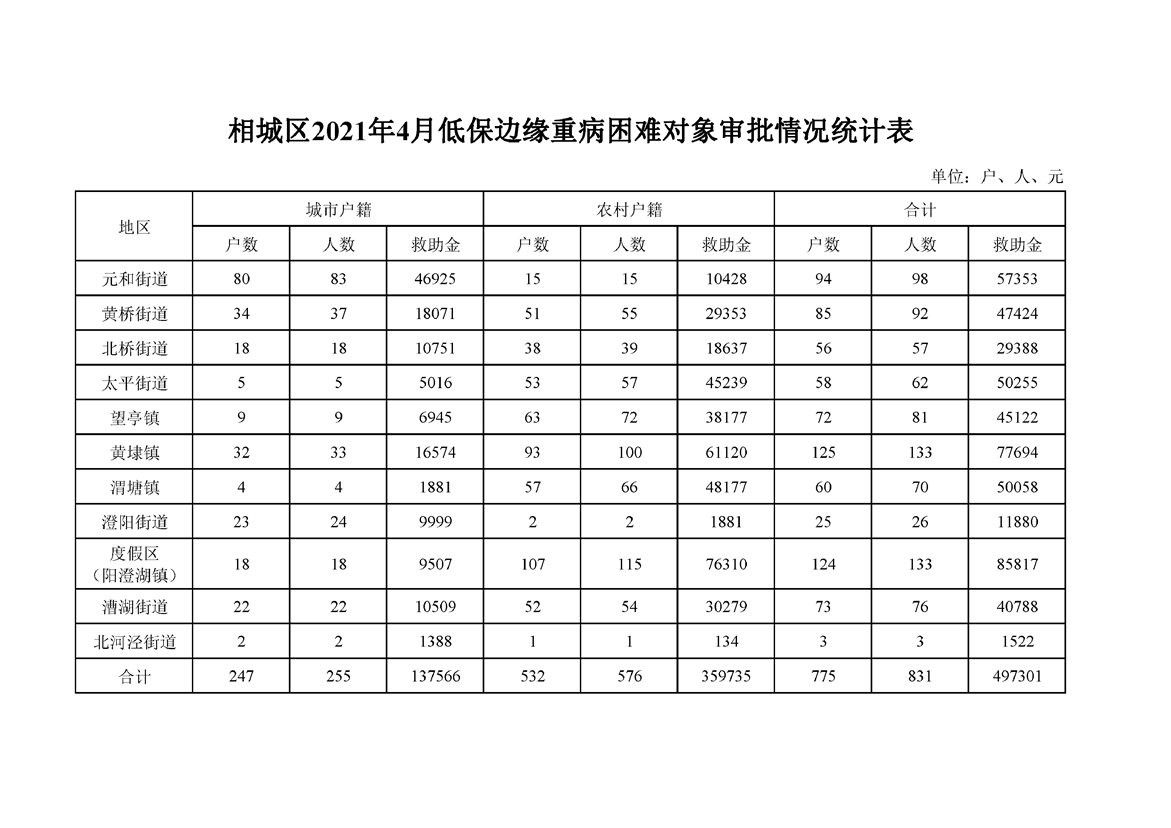 相城區(qū)2021年4月低保邊緣重病困難對象審批情況統(tǒng)計表
