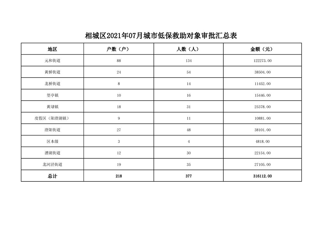 相城區(qū)2021年07月城市低保救助對(duì)象審批匯總表