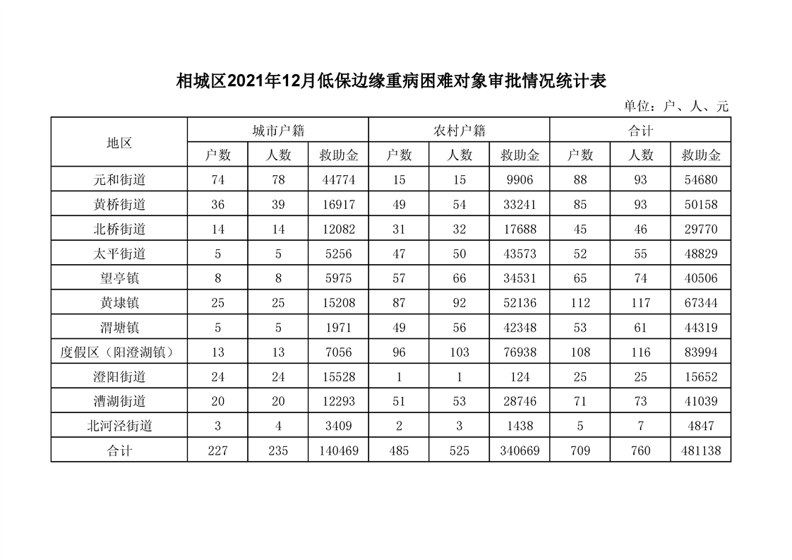 相城區(qū)2021年12月低保邊緣重病困難對象審批情況統(tǒng)計(jì)表