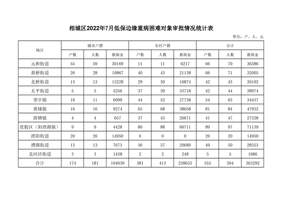 相城區(qū)2022年7月低保邊緣重病困難對(duì)象審批情況統(tǒng)計(jì)表