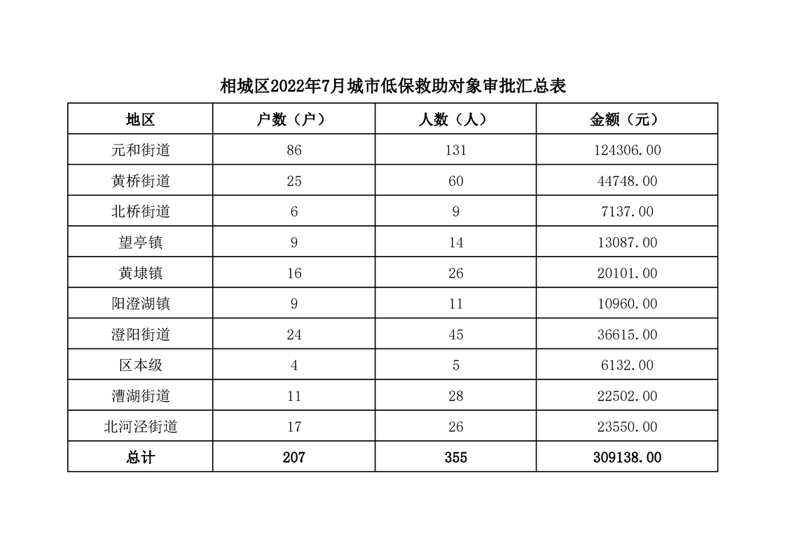 相城區(qū)2022年7月城市低保救助對象審批匯總表