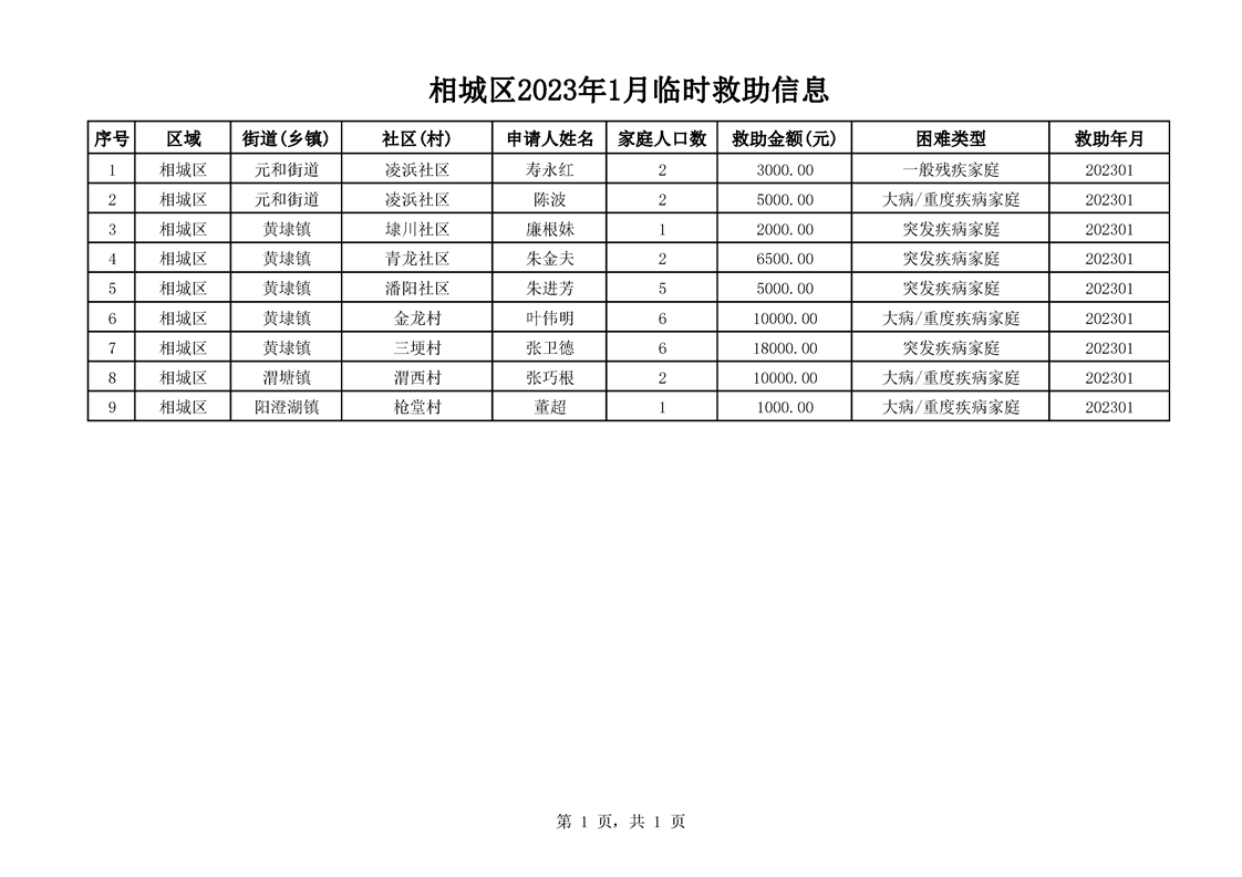 相城區(qū)2023年1月臨時救助信息