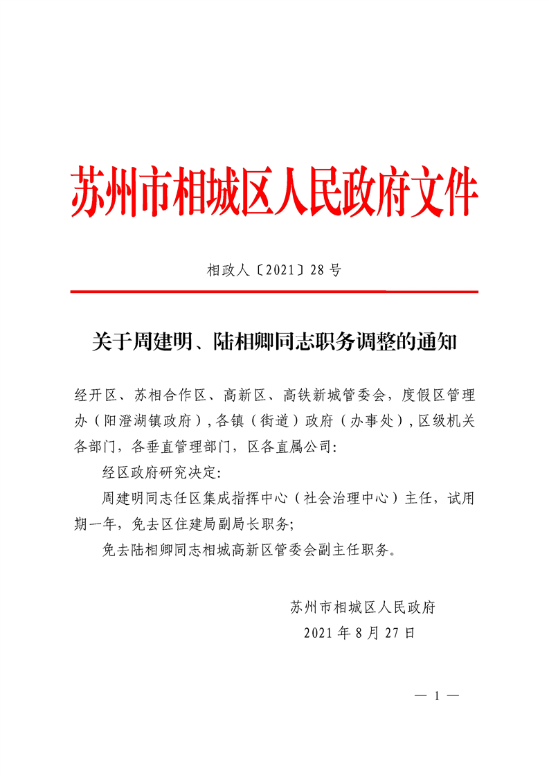 關(guān)于周建明、陸相卿同志職務(wù)調(diào)整的通知