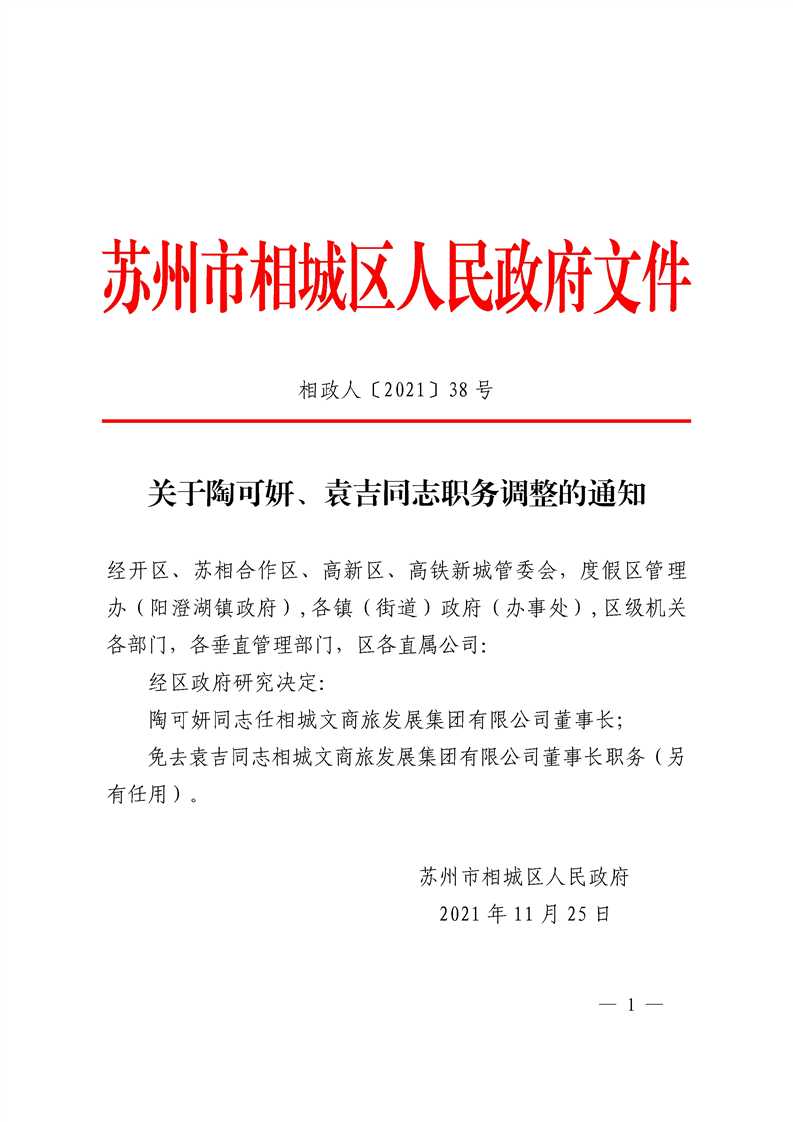 區(qū)政府關于陶可妍、袁吉同志職務調整的通知