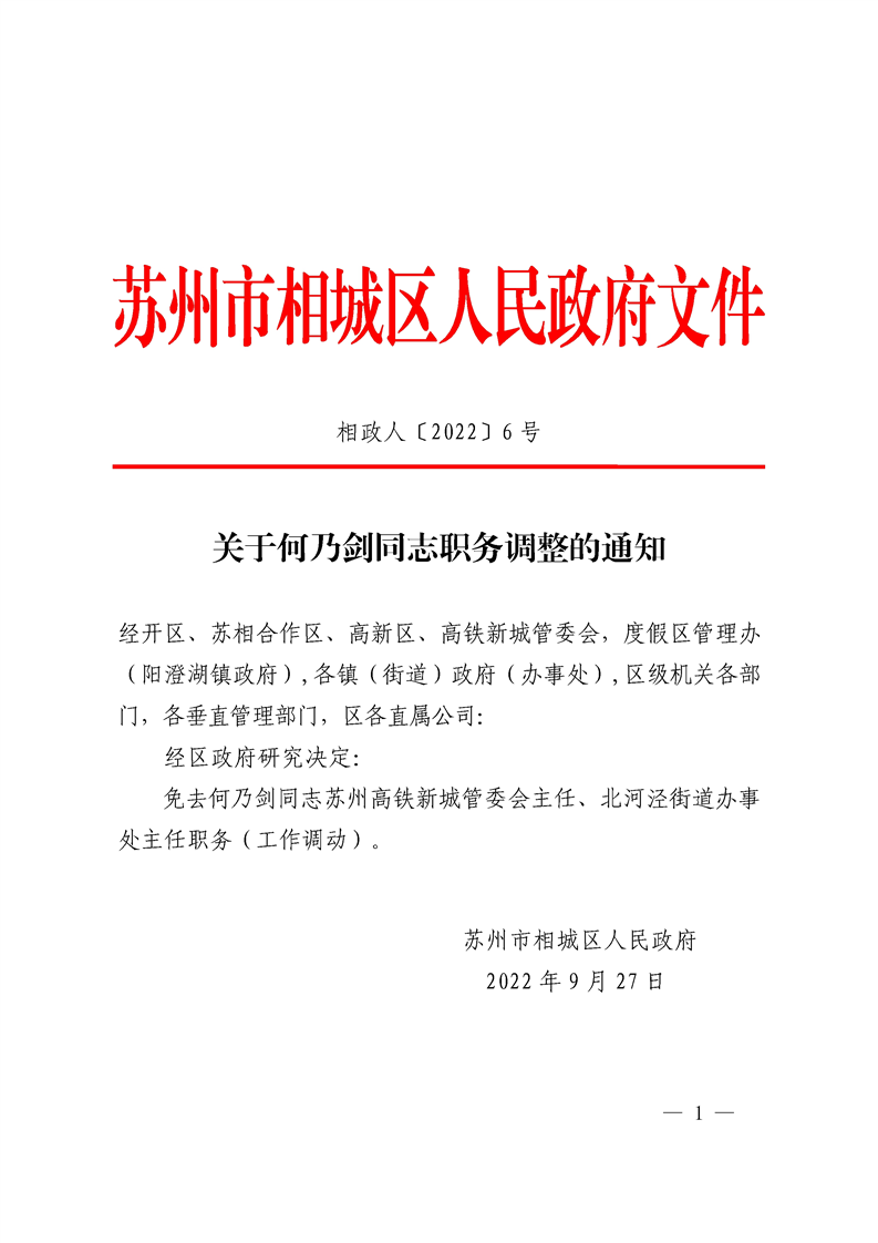 區(qū)政府關(guān)于何乃劍同志職務(wù)調(diào)整的通知