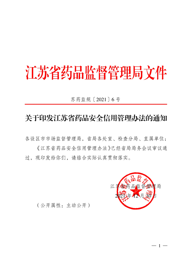 關于印發(fā)江蘇省藥品安全信用管理辦法的通知(蘇藥監(jiān)規(guī)〔2021〕6號)