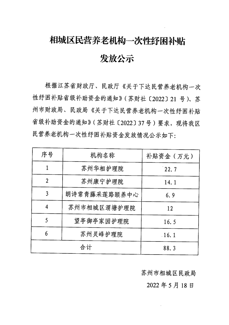 相城區(qū)民營養(yǎng)老機(jī)構(gòu)一次性紓困補(bǔ)貼發(fā)放公示