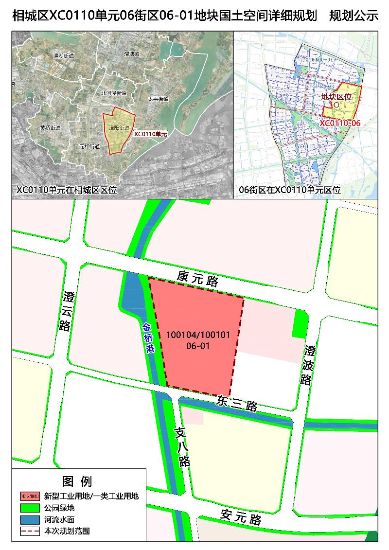本次規(guī)劃對(duì)象為相城區(qū)XC0110單元06街區(qū)的06-01地塊。06-01地塊位于相城區(qū)澄陽(yáng)街道,具體范圍為北至康元路、南至東三路、西至金橋港、東至現(xiàn)狀企業(yè)用地邊界,占地面積6.82公頃。